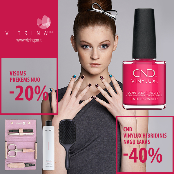 Puiki proga palepinti save, kadangi VITRIPRO parduotuvėse nuolaidos visoms prekėms! VITRINAPRO parduotuvėje rasi CND Shellac bei Vinylux nagų lakų įvairovę. Platų depiliacijos priemonių asortimentą. Naujausių modelių KOSMART rankų darbo aksesuarų, SWAROVKSI kristalais ir perlais puoštais GEOMETRIX auskarų. SALERM Makeup profesionalią dekoratyvinę kosmetiką.  CHI – vienas iš geriausių prekių ženklų kosmetikos pasaulyje, siūlantis stilistams, meistrams ir jų klientams analogų neturinčias priemones. Rūpintis savimi lenga su VITRINAPRO!